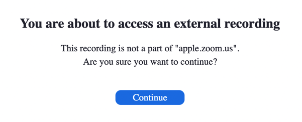 An attacker can change the URL of their own meeting recordings to your company domain to make it appear as though the content is hosted by your company. Unlike with our Box examples, this will (usually, but not always in our tests) result in a warning message, letting you know that you’re about to access external content that’s not part of your domain: