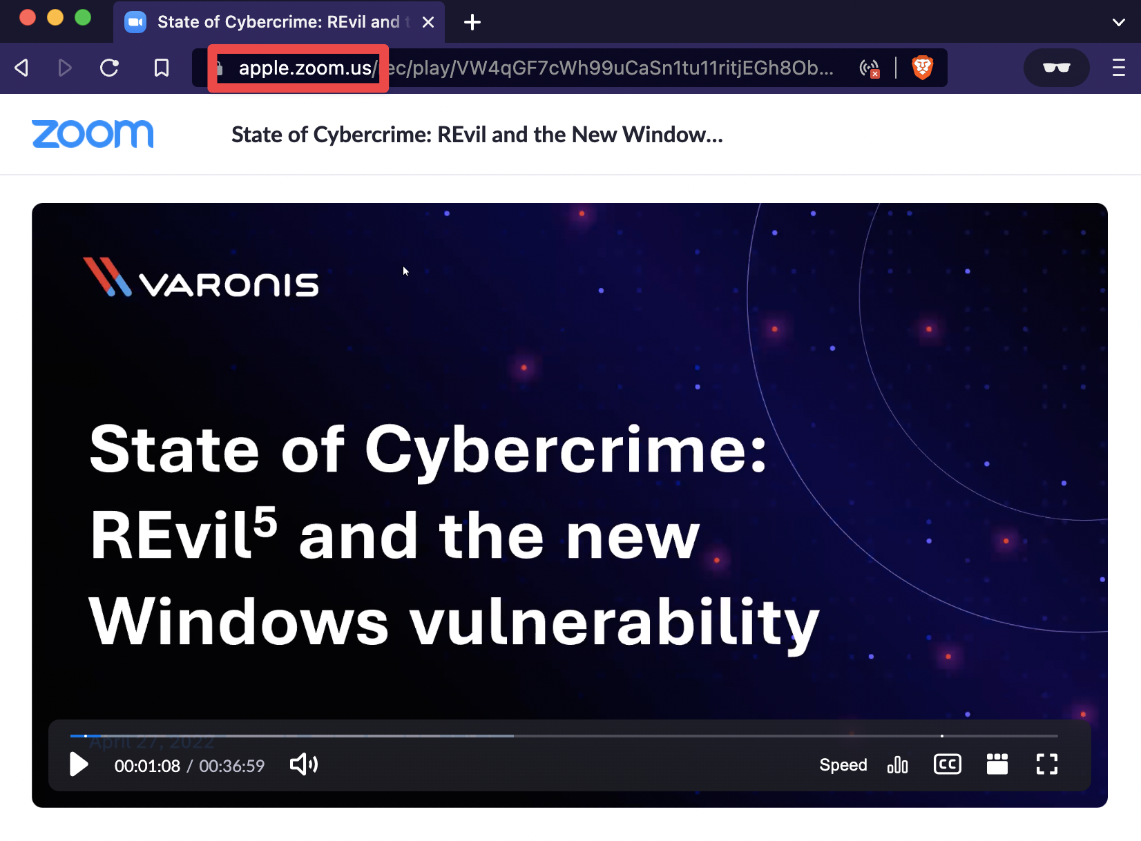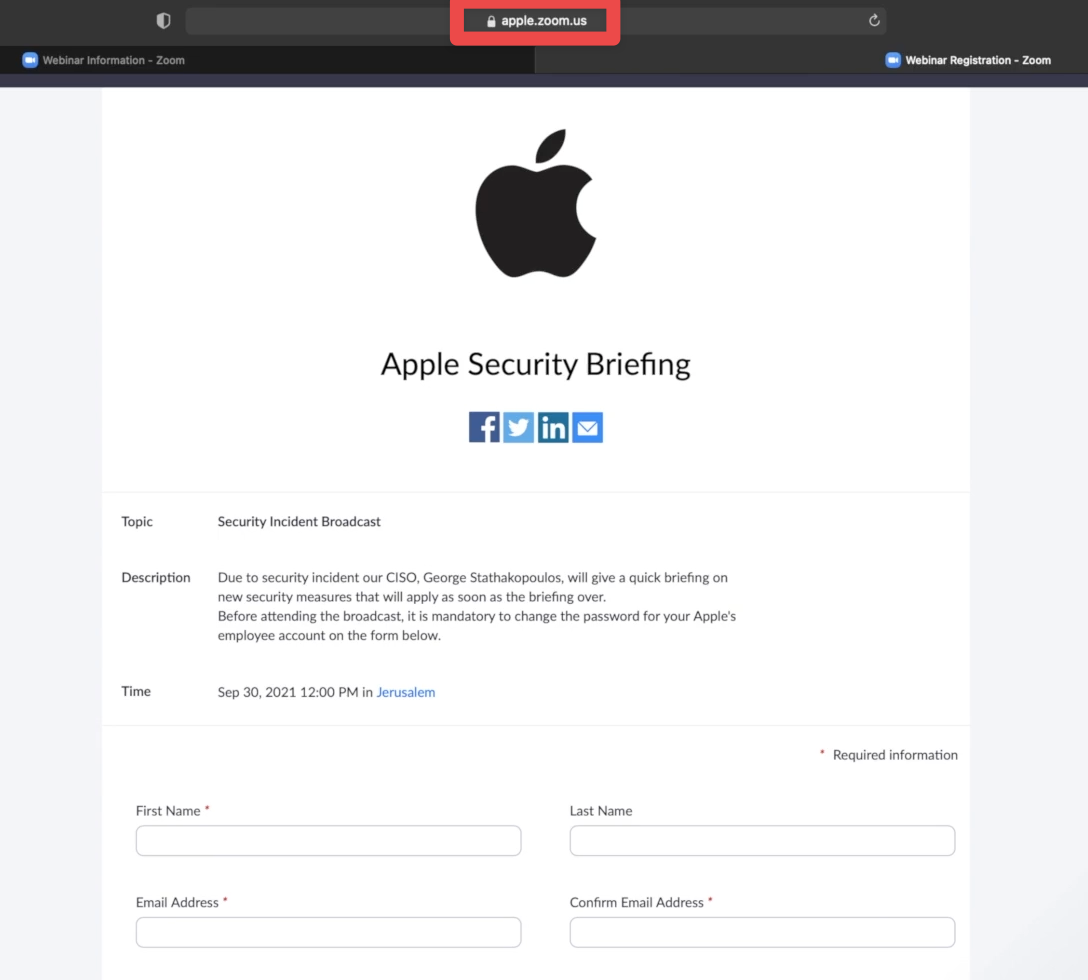 Here’s a webinar we created in our own Zoom account. We branded our account using Apple’s logo and changed the subdomain in the URL of the registration page from varonis.zoom.us to apple.zoom.us and it loaded our form: